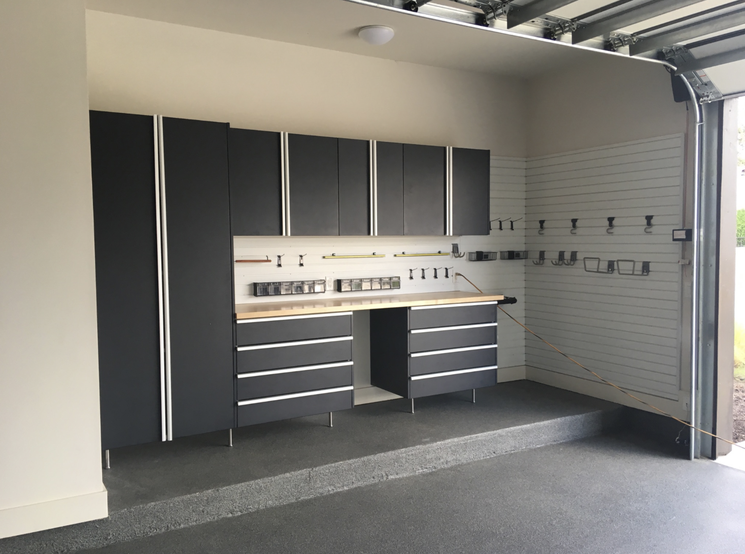 See how we upgraded a garage in Barton Creek (Austin, TX) with Organizers Direct Basalt powder-coated cabinets, slatwall storage, and a custom work area.